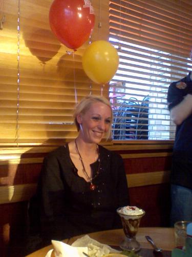 Saturday morning Bret left the house early to go into work to decorate it with birthday stuff with the help of a coworker, who also sweetly baked Kim a cake. Kim was pleasantly surprised when she got to work. I thought that was very sweet of Bret. After she got off work I picked her and Bret up and including Leslie and Carrisa, we all went to Red Robin for dinner. It was really nice spending time with each other. While Kim was in the restroom, Bret went and found our server to tell him it was Kim's birthday so we could surprise her / embarrass her at the end of dinner. Which they happily obliged by making her wear two balloons tied together behind her ears as they sang very loudly a Red Robin version of Happy Birthday. The rewarded her with a free birthday Sundae.